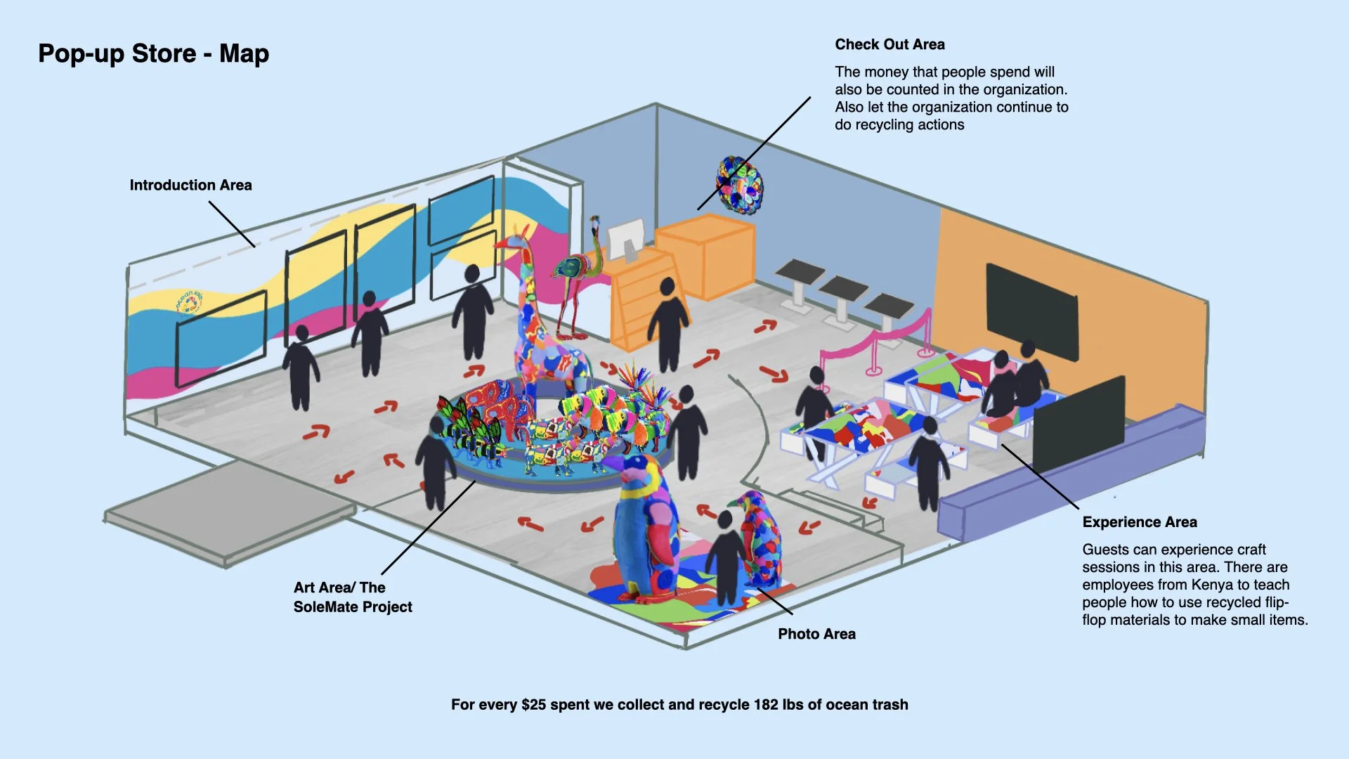 Stores showcasing the history of the organization, art merchandise and craft experience areas.