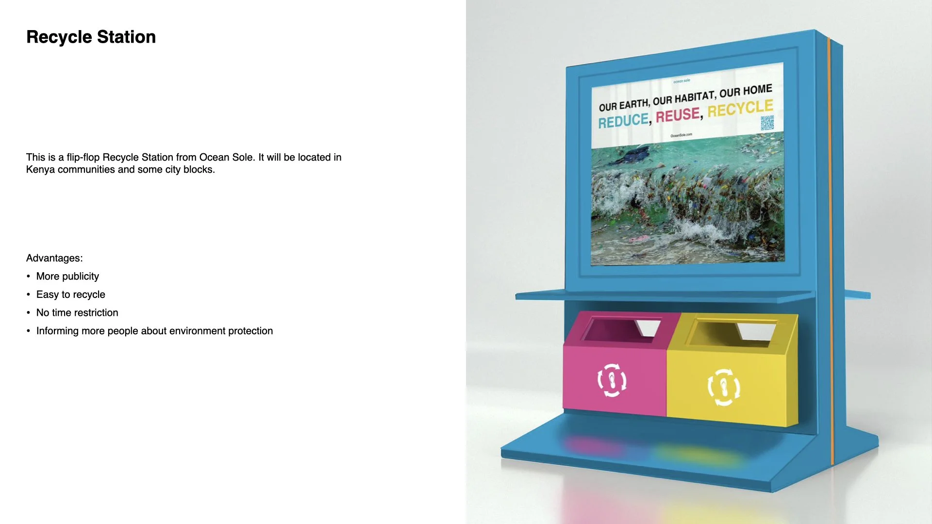 Ocean Sole is a registered non-profit organization that aims to clean Kenya's polluted beaches and waterways and provide careers to Artisans in high-impact communities. They hold weekly beach cleanups to protect the ocean from further damage from slippers and plastic pollution. They also collect discarded flip-flops at the beach and turn them into art and functional products. Spread and raise awareness of Marine conservation and current pollution issues visually in a fun and creative way. It also engages with he community to provide equal employment opportunities. This organization sends an important message of how they can help improve our planet, oceans, and people by creating beautiful art that portrays the state of their oceans.
